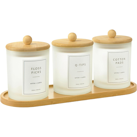 Custom Q Tip Wattenstaafje Houder Dispenser Badkamer Set, Apotheker Potten Met Bamboe Deksels